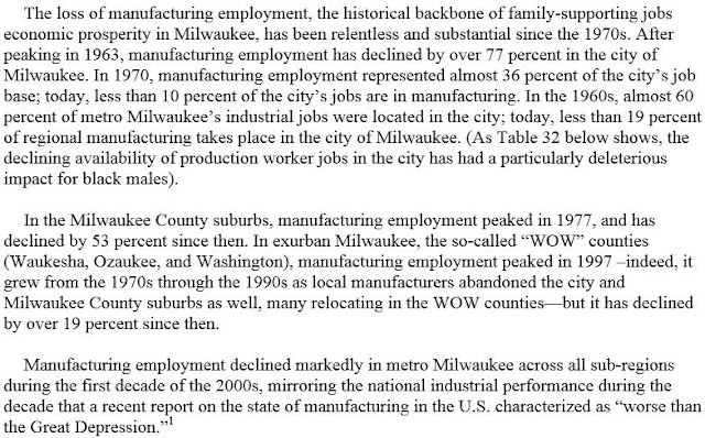 The following 11 images are taken from a March, 2007, report by the UW-Milwaukee Center for Economic Development, titled, The Crisis of Black Male Joblessness in Milwaukee (https://www4.uwm.edu/ced/publications/blackcrisis307.pdf). These figures may seem somewhat outdated, however, since 2007 there's been the Great Recession, with only a nominal recovery thereafter, so although the report is eight years old it is likely still very relevant: